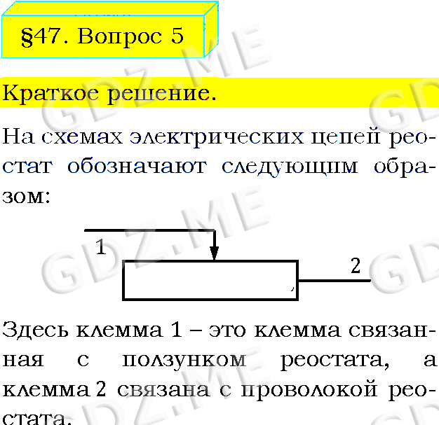 Подробный вариант решения из решебника (ГДЗ): Задание номер 5 (§47. Реостат. Вопросы) по предмету Физика, за 8 класс, авторы учебника Пёрышкин А.В..