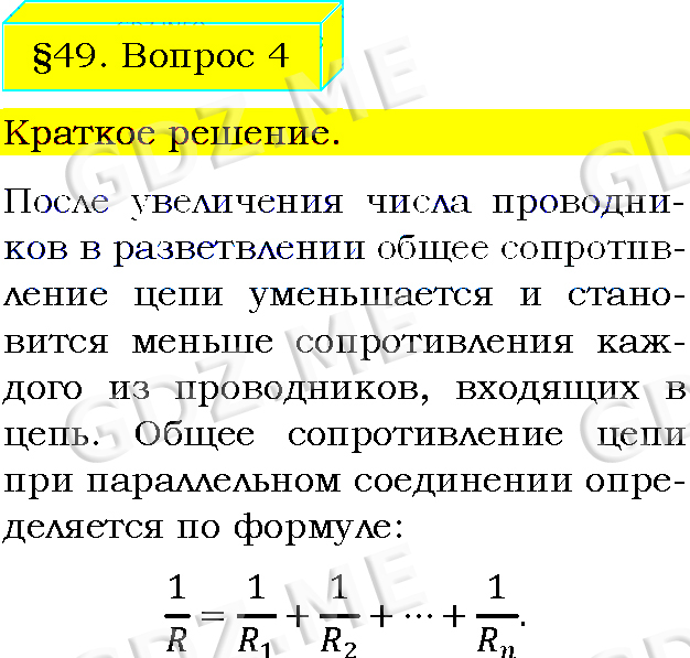 Подробный вариант решения из решебника (ГДЗ): Задание номер 4 (§49. Параллельное соединение проводников. Вопросы) по предмету Физика, за 8 класс, авторы учебника Пёрышкин А.В..