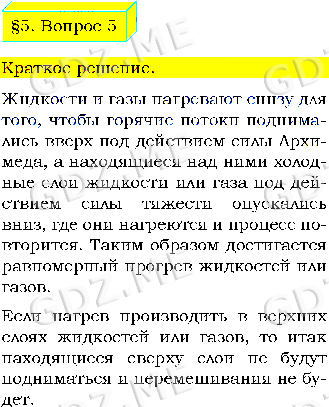 Подробный вариант решения из решебника (ГДЗ): Задание номер 5 (§5. Конвекция. Вопросы) по предмету Физика, за 8 класс, авторы учебника Пёрышкин А.В..