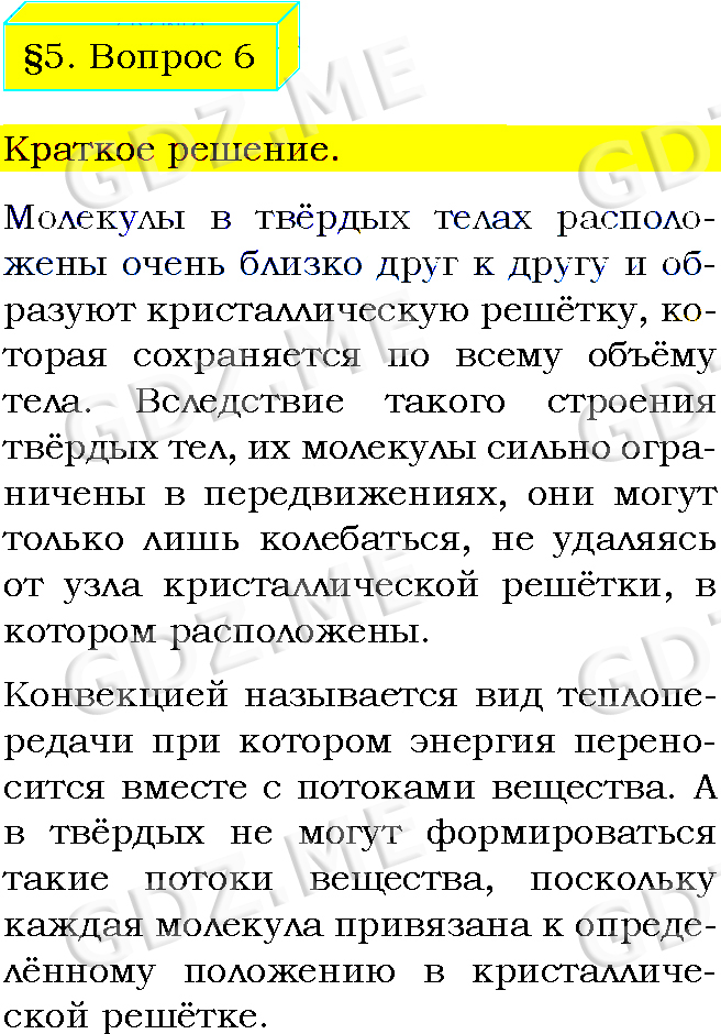 Подробный вариант решения из решебника (ГДЗ): Задание номер 6 (§5. Конвекция. Вопросы) по предмету Физика, за 8 класс, авторы учебника Пёрышкин А.В..