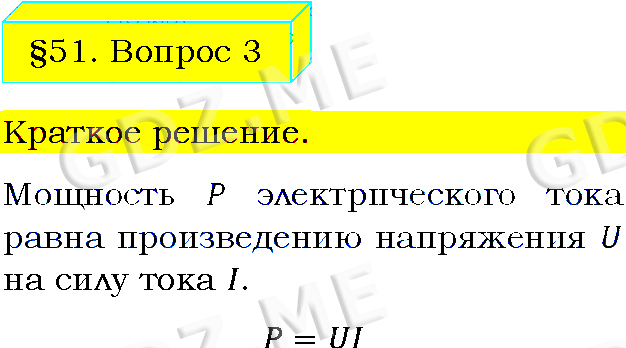 Подробный вариант решения из решебника (ГДЗ): Задание номер 3 (§51. Мощность электрического тока. Вопросы) по предмету Физика, за 8 класс, авторы учебника Пёрышкин А.В..