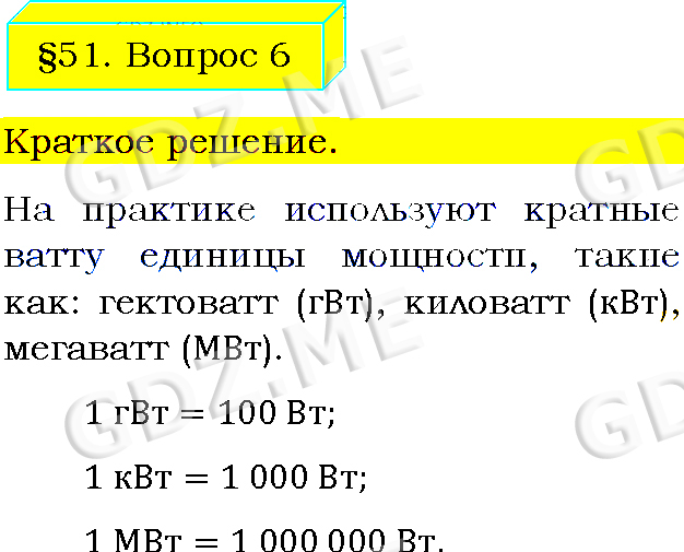 Подробный вариант решения из решебника (ГДЗ): Задание номер 6 (§51. Мощность электрического тока. Вопросы) по предмету Физика, за 8 класс, авторы учебника Пёрышкин А.В..