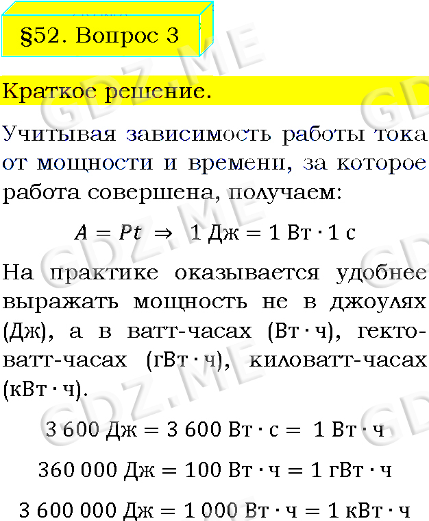 Подробный вариант решения из решебника (ГДЗ): Задание номер 3 (§52. Единицы работы электрического тока, применяемые на практике. Вопросы) по предмету Физика, за 8 класс, авторы учебника Пёрышкин А.В..