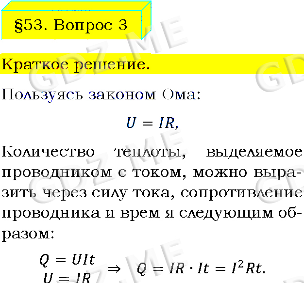 Подробный вариант решения из решебника (ГДЗ): Задание номер 3 (§53. Нагревание проводников электрическим током. Закон Джоуля—Ленца. Вопросы) по предмету Физика, за 8 класс, авторы учебника Пёрышкин А.В..