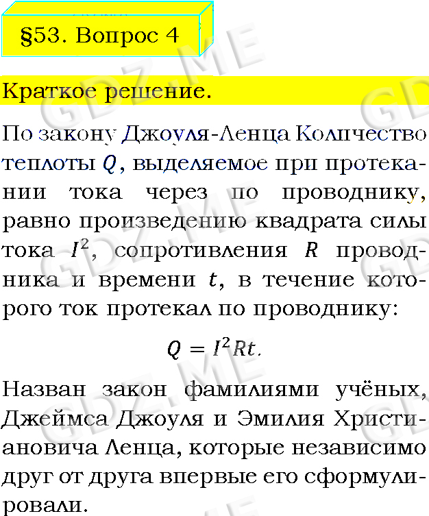 Подробный вариант решения из решебника (ГДЗ): Задание номер 4 (§53. Нагревание проводников электрическим током. Закон Джоуля—Ленца. Вопросы) по предмету Физика, за 8 класс, авторы учебника Пёрышкин А.В..