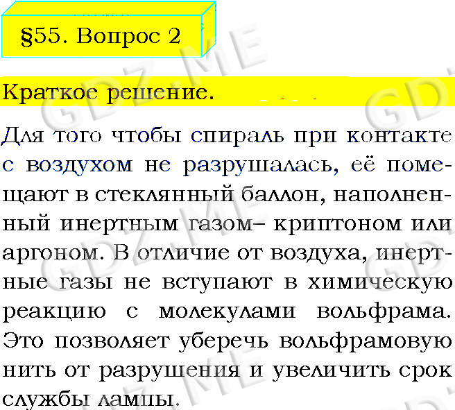 Подробный вариант решения из решебника (ГДЗ): Задание номер 2 (§55. Лампа накаливания. Электрические нагревательные приборы. Вопросы) по предмету Физика, за 8 класс, авторы учебника Пёрышкин А.В..