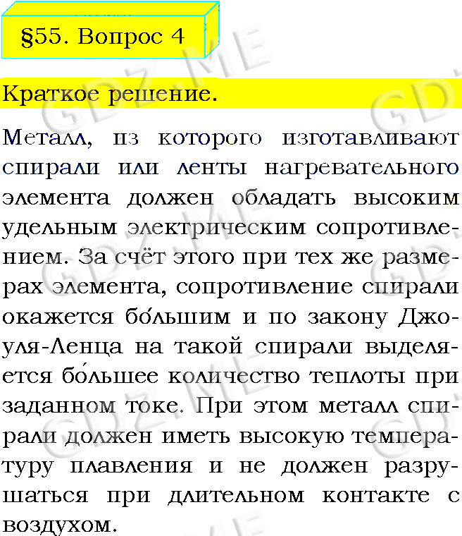 Подробный вариант решения из решебника (ГДЗ): Задание номер 4 (§55. Лампа накаливания. Электрические нагревательные приборы. Вопросы) по предмету Физика, за 8 класс, авторы учебника Пёрышкин А.В..