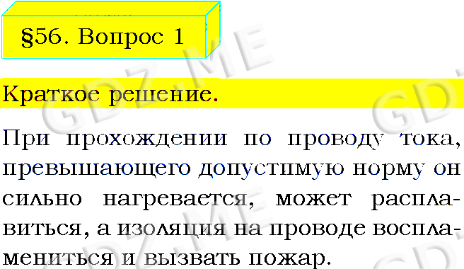 Подробный вариант решения из решебника (ГДЗ): Задание номер 1 (§56. Короткое замыкание. Предохранители. Вопросы) по предмету Физика, за 8 класс, авторы учебника Пёрышкин А.В..