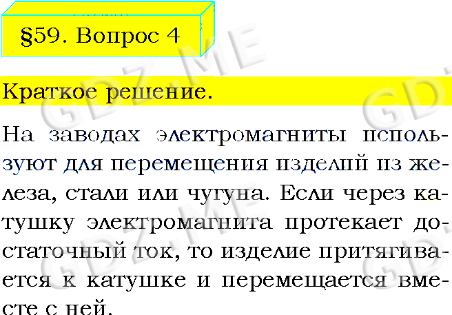 Подробный вариант решения из решебника (ГДЗ): Задание номер 4 (§59. Магнитное поле катушки с током. Электромагниты и их применение. Вопросы) по предмету Физика, за 8 класс, авторы учебника Пёрышкин А.В..