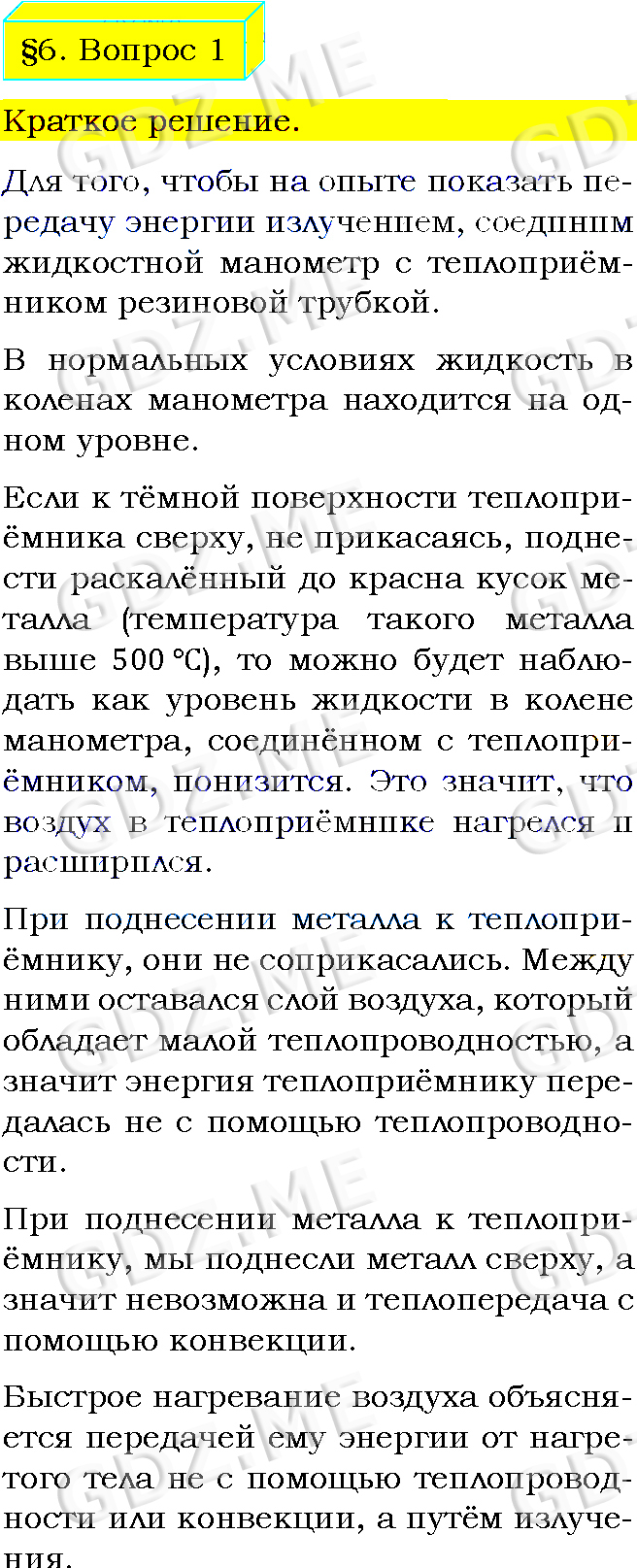 Подробный вариант решения из решебника (ГДЗ): Задание номер 1 (§6. Излучение. Вопросы) по предмету Физика, за 8 класс, авторы учебника Пёрышкин А.В..