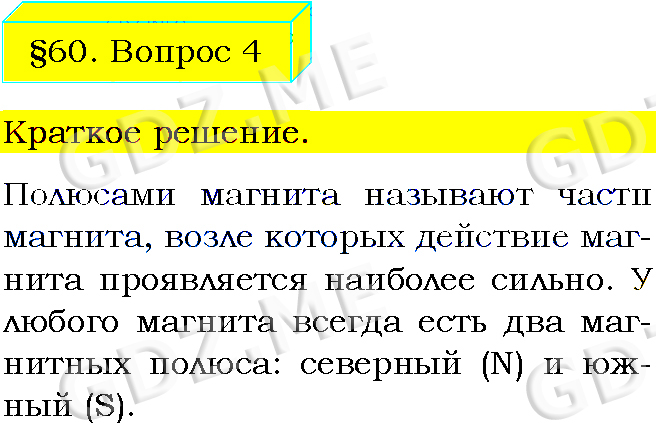 Подробный вариант решения из решебника (ГДЗ): Задание номер 4 (§60. Постоянные магниты. Магнитное поле постоянных магнитов. Вопросы) по предмету Физика, за 8 класс, авторы учебника Пёрышкин А.В..