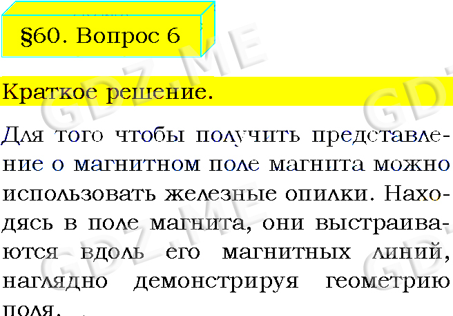 Подробный вариант решения из решебника (ГДЗ): Задание номер 6 (§60. Постоянные магниты. Магнитное поле постоянных магнитов. Вопросы) по предмету Физика, за 8 класс, авторы учебника Пёрышкин А.В..