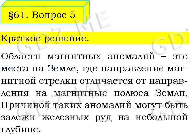 Подробный вариант решения из решебника (ГДЗ): Задание номер 5 (§61. Магнитное поле Земли. Вопросы) по предмету Физика, за 8 класс, авторы учебника Пёрышкин А.В..