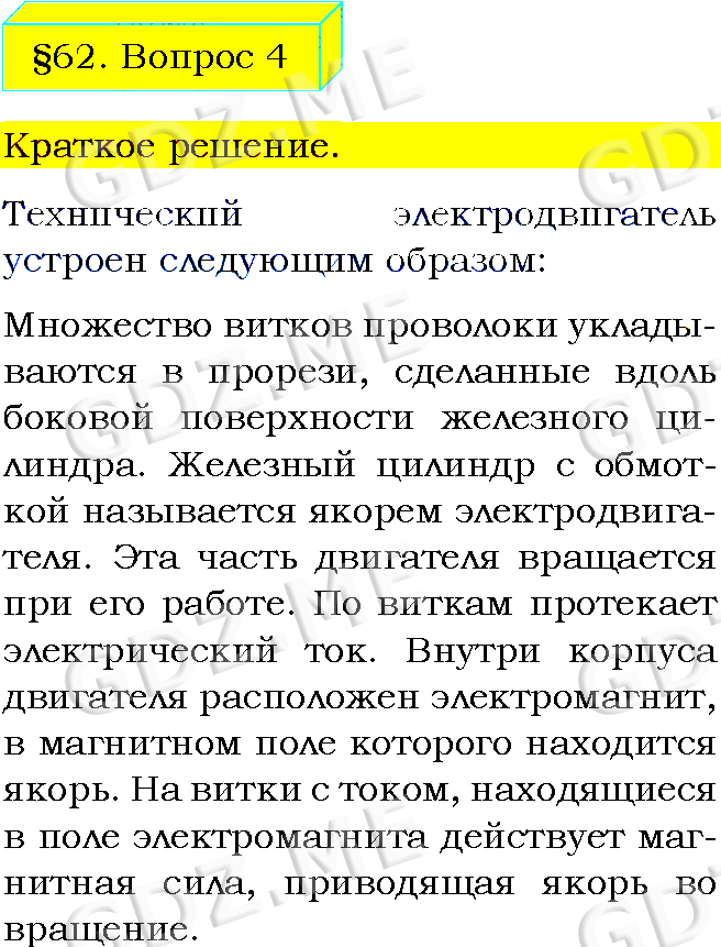 Подробный вариант решения из решебника (ГДЗ): Задание номер 4 (§62. Действие магнитного поля на проводник с током. Электрический двигатель. Вопросы) по предмету Физика, за 8 класс, авторы учебника Пёрышкин А.В..