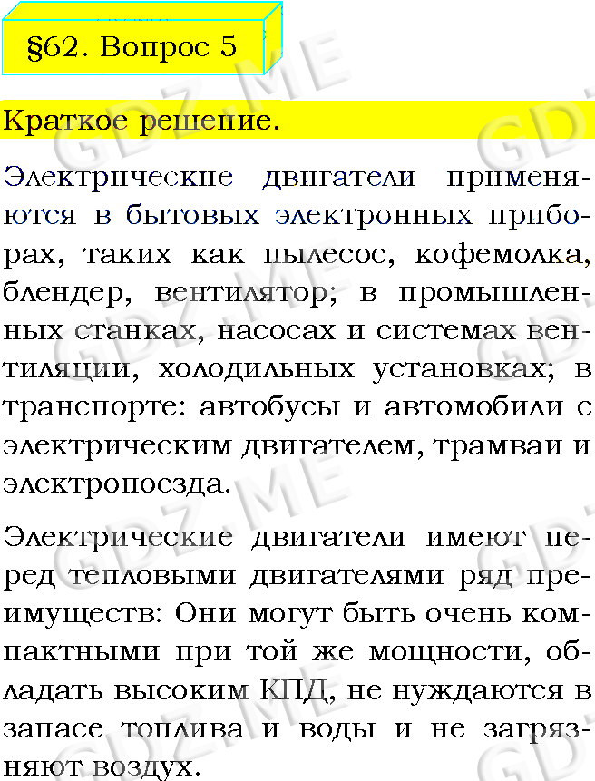 Подробный вариант решения из решебника (ГДЗ): Задание номер 5 (§62. Действие магнитного поля на проводник с током. Электрический двигатель. Вопросы) по предмету Физика, за 8 класс, авторы учебника Пёрышкин А.В..