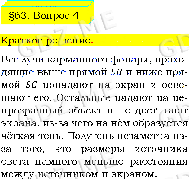 Подробный вариант решения из решебника (ГДЗ): Задание номер 4 (§63. Источники света. Распространение света. Вопросы) по предмету Физика, за 8 класс, авторы учебника Пёрышкин А.В..