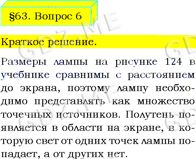 Подробный вариант решения из решебника (ГДЗ): Задание номер 6 (§63. Источники света. Распространение света. Вопросы) по предмету Физика, за 8 класс, авторы учебника Пёрышкин А.В..