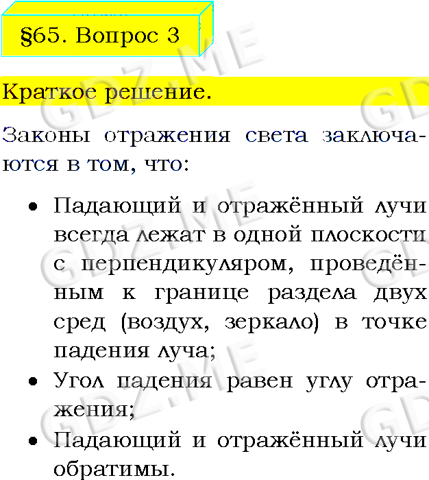Подробный вариант решения из решебника (ГДЗ): Задание номер 3 (§65. Отражение света. Закон отражения света. Вопросы) по предмету Физика, за 8 класс, авторы учебника Пёрышкин А.В..