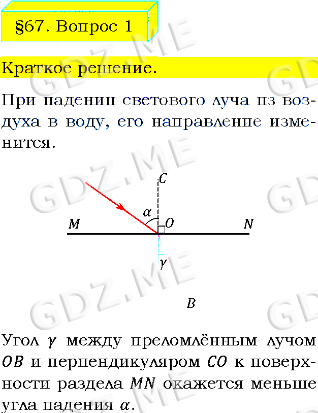 Подробный вариант решения из решебника (ГДЗ): Задание номер 1 (§67. Преломление света. Закон преломления света. Вопросы) по предмету Физика, за 8 класс, авторы учебника Пёрышкин А.В..