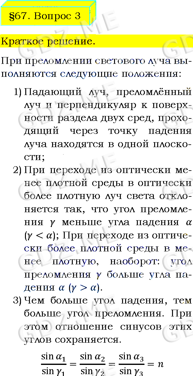 Подробный вариант решения из решебника (ГДЗ): Задание номер 3 (§67. Преломление света. Закон преломления света. Вопросы) по предмету Физика, за 8 класс, авторы учебника Пёрышкин А.В..