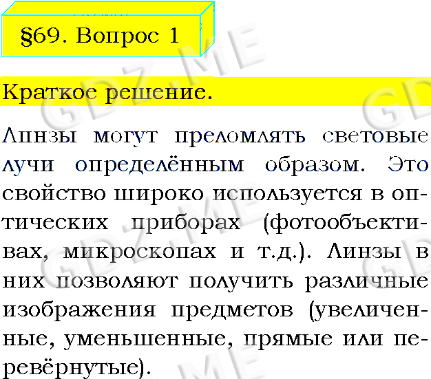 Подробный вариант решения из решебника (ГДЗ): Задание номер 1 (§69. Изображения, даваемые линзой. Вопросы) по предмету Физика, за 8 класс, авторы учебника Пёрышкин А.В..