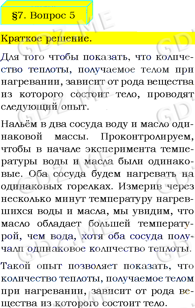 Подробный вариант решения из решебника (ГДЗ): Задание номер 5 (§7. Количество теплоты. Единицы количества теплоты. Вопросы) по предмету Физика, за 8 класс, авторы учебника Пёрышкин А.В..