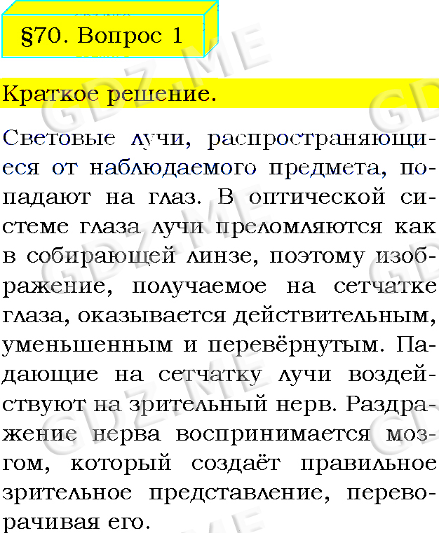 Подробный вариант решения из решебника (ГДЗ): Задание номер 1 (§70. Глаз и зрение. Вопросы) по предмету Физика, за 8 класс, авторы учебника Пёрышкин А.В..