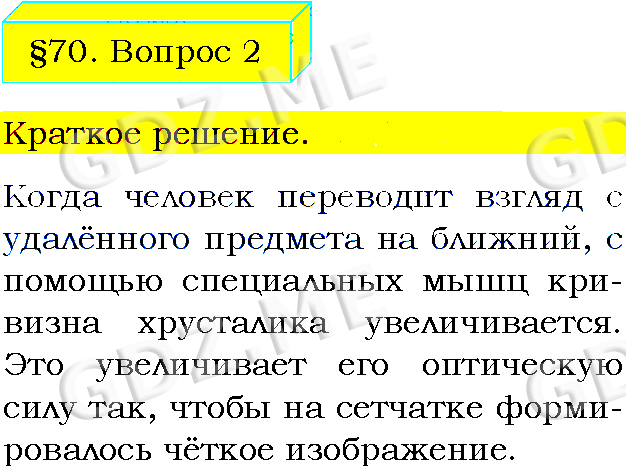 Подробный вариант решения из решебника (ГДЗ): Задание номер 2 (§70. Глаз и зрение. Вопросы) по предмету Физика, за 8 класс, авторы учебника Пёрышкин А.В..