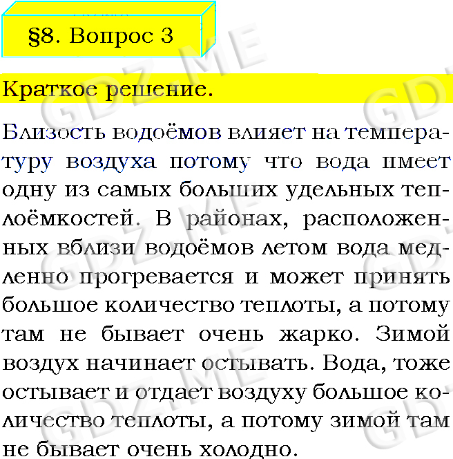 Подробный вариант решения из решебника (ГДЗ): Задание номер 3 (§8. Удельная теплоёмкость. Вопросы) по предмету Физика, за 8 класс, авторы учебника Пёрышкин А.В..
