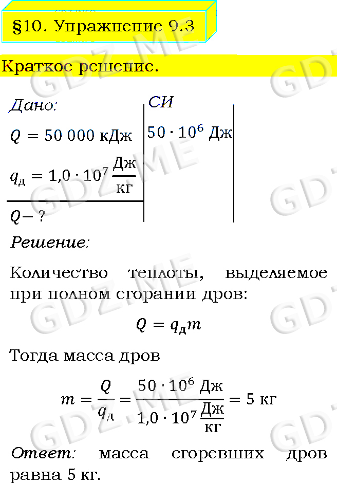 Подробный вариант решения из решебника (ГДЗ): Упражнение номер 3 (§10. Энергия топлива. Удельная теплота сгорания. Упражнение 9) по предмету Физика, за 8 класс, авторы учебника Пёрышкин А.В..