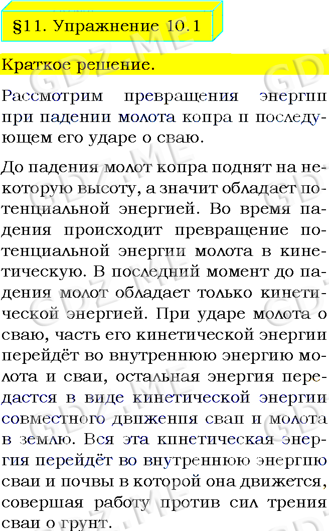 Подробный вариант решения из решебника (ГДЗ): Упражнение номер 1 (§11. Закон сохранения и превращения энергии в механических и тепловых процессах. Упражнение 10) по предмету Физика, за 8 класс, авторы учебника Пёрышкин А.В..