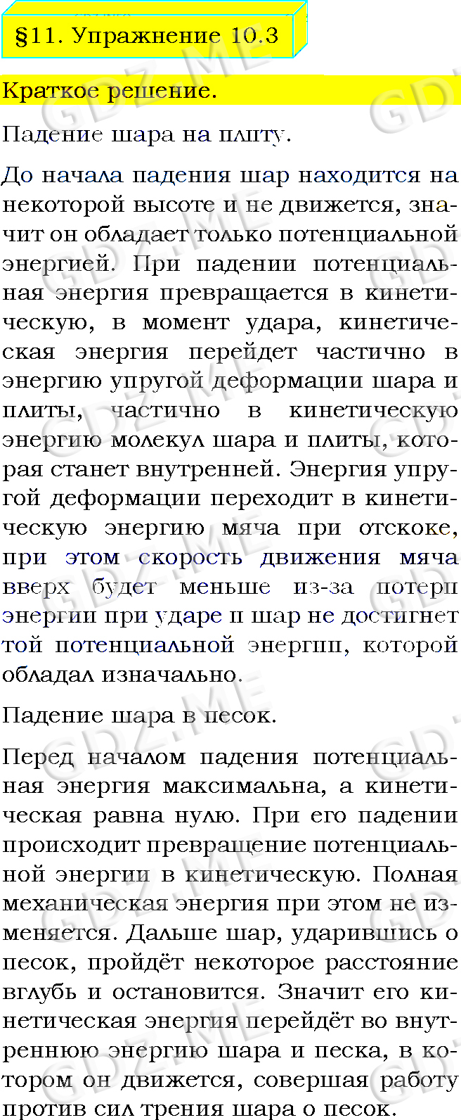 Подробный вариант решения из решебника (ГДЗ): Упражнение номер 3 (§11. Закон сохранения и превращения энергии в механических и тепловых процессах. Упражнение 10) по предмету Физика, за 8 класс, авторы учебника Пёрышкин А.В..