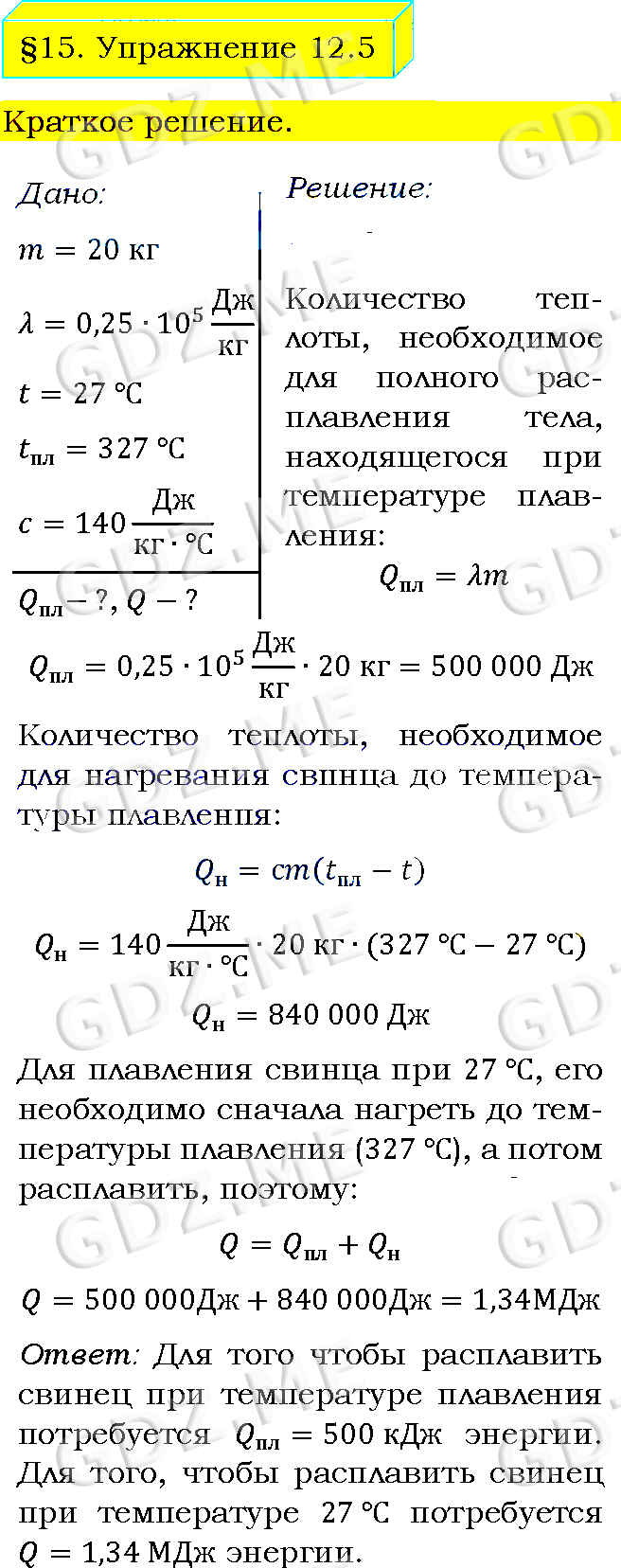 Подробный вариант решения из решебника (ГДЗ): Упражнение номер 5 (§15. Удельная теплота плавления. Упражнение 12) по предмету Физика, за 8 класс, авторы учебника Пёрышкин А.В..