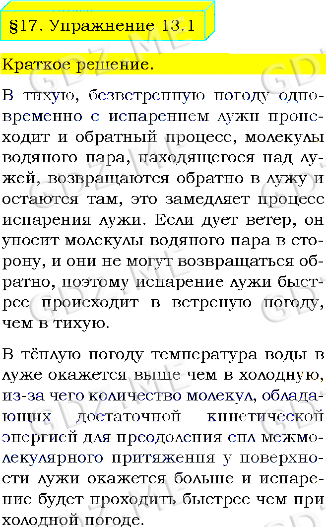 Подробный вариант решения из решебника (ГДЗ): Упражнение номер 1 (§17. Поглощение энергии при испарении жидкости и выделение её при конденсации пара. Упражнение 13) по предмету Физика, за 8 класс, авторы учебника Пёрышкин А.В..
