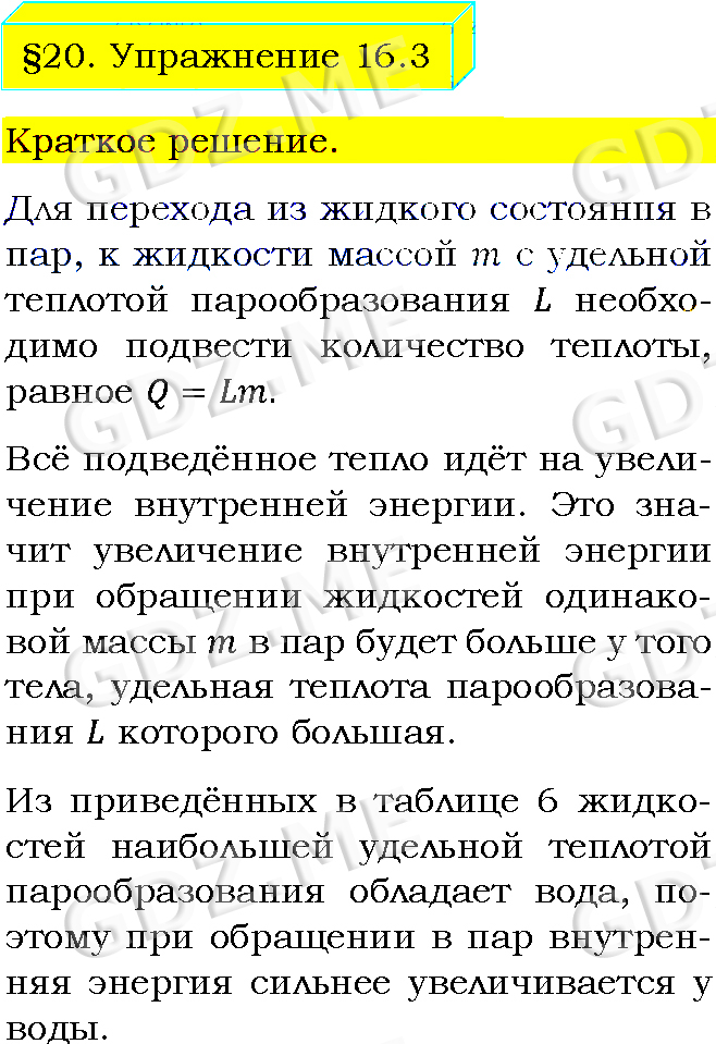 Подробный вариант решения из решебника (ГДЗ): Упражнение номер 3 (§20. Удельная теплота парообразования и конденсации. Упражнение 16) по предмету Физика, за 8 класс, авторы учебника Пёрышкин А.В..
