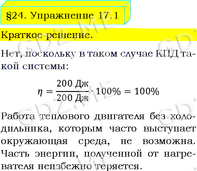 Подробный вариант решения из решебника (ГДЗ): Упражнение номер 1 (§24. КПД теплового двигателя. Упражнение 17) по предмету Физика, за 8 класс, авторы учебника Пёрышкин А.В..