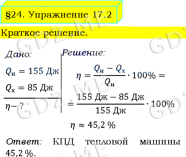 Подробный вариант решения из решебника (ГДЗ): Упражнение номер 2 (§24. КПД теплового двигателя. Упражнение 17) по предмету Физика, за 8 класс, авторы учебника Пёрышкин А.В..