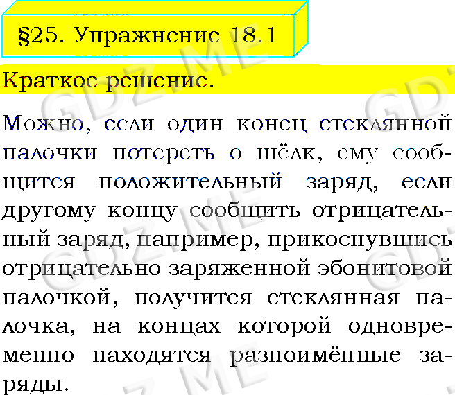 Подробный вариант решения из решебника (ГДЗ): Упражнение номер 1 (§25. Электризация тел при соприкосновении. Взаимодействие заряженных тел. Упражнение 18) по предмету Физика, за 8 класс, авторы учебника Пёрышкин А.В..