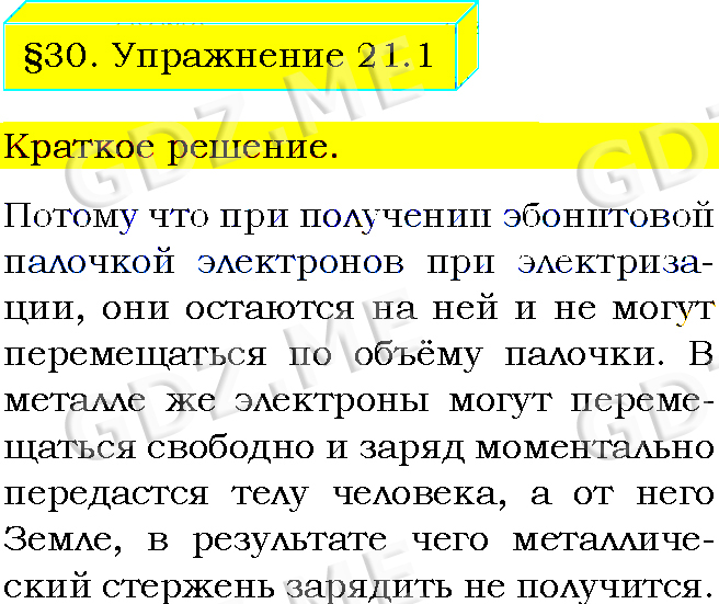 Подробный вариант решения из решебника (ГДЗ): Упражнение номер 1 (§30. Объяснение электрических явлений. Упражнение 21) по предмету Физика, за 8 класс, авторы учебника Пёрышкин А.В..