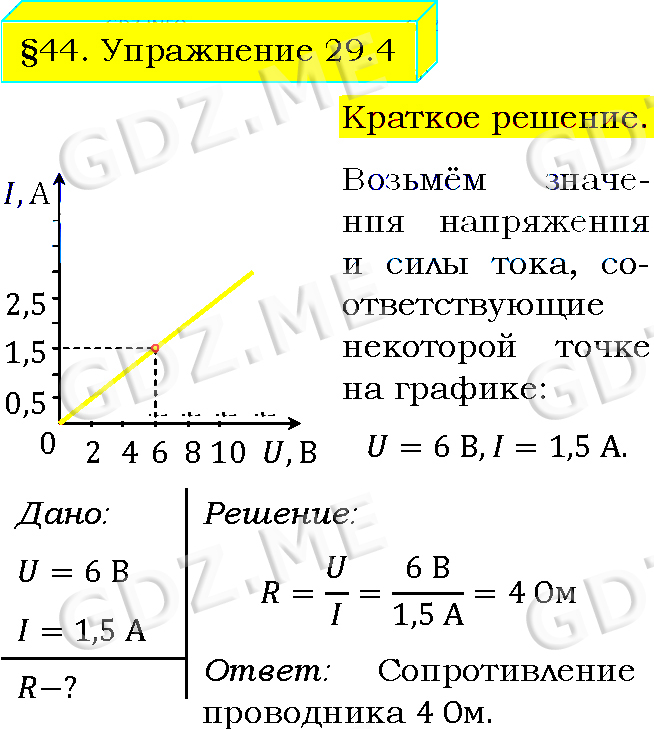 Подробный вариант решения из решебника (ГДЗ): Упражнение номер 4 (§44. Закон Ома для участка цепи. Упражнение 29) по предмету Физика, за 8 класс, авторы учебника Пёрышкин А.В..