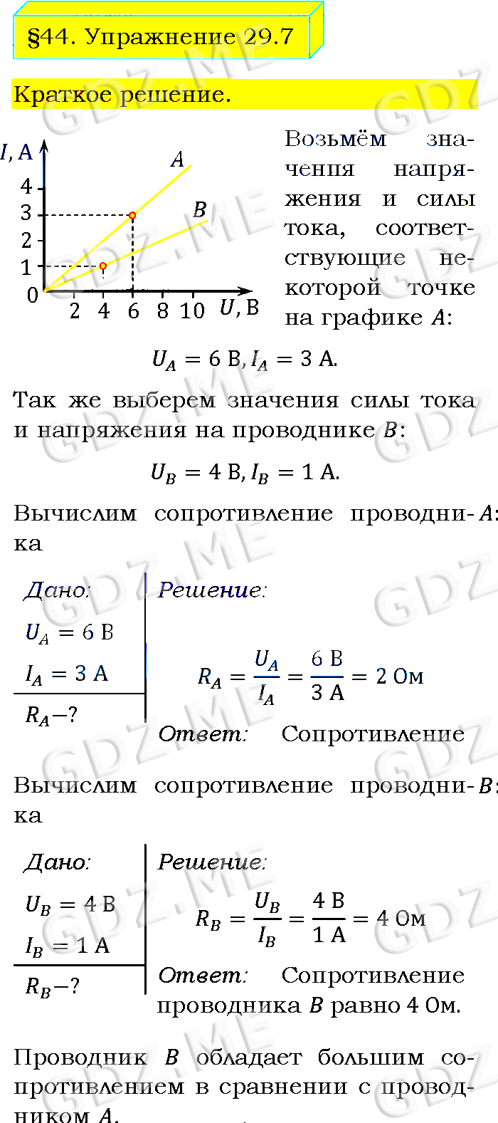 Подробный вариант решения из решебника (ГДЗ): Упражнение номер 7 (§44. Закон Ома для участка цепи. Упражнение 29) по предмету Физика, за 8 класс, авторы учебника Пёрышкин А.В..