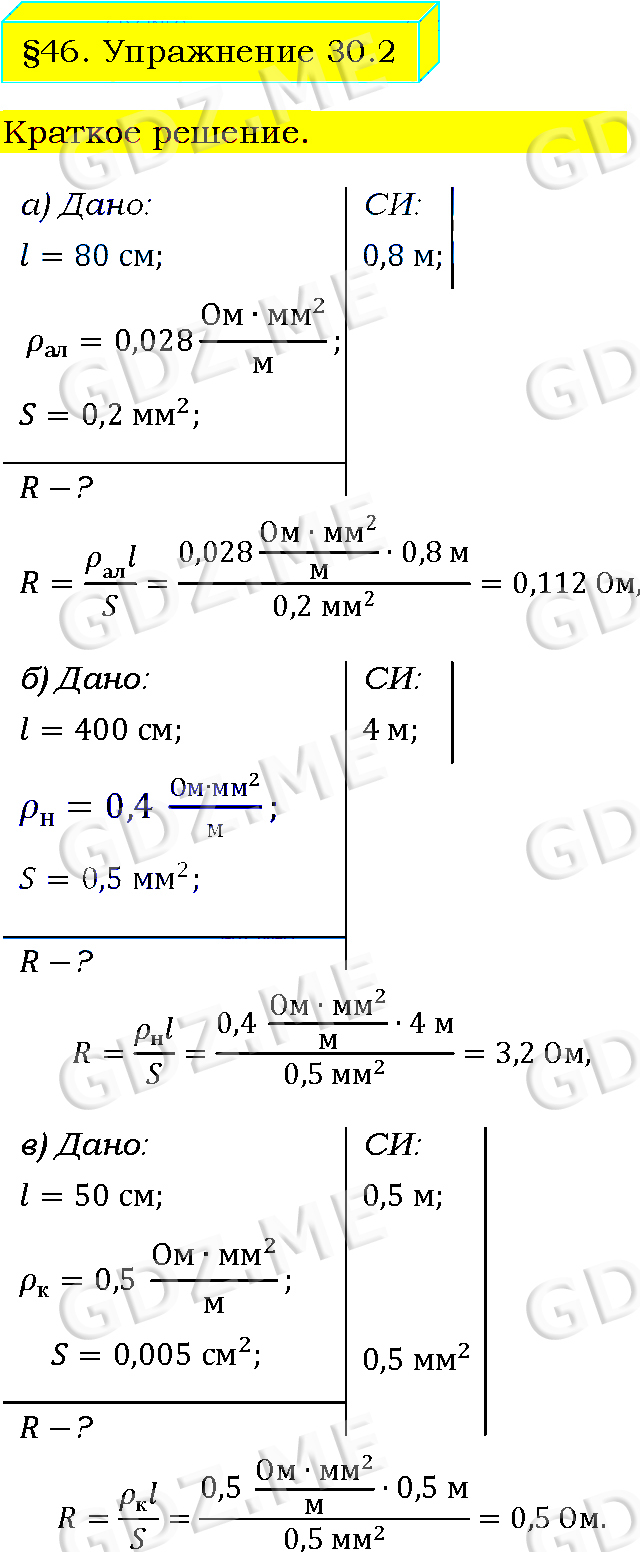Подробный вариант решения из решебника (ГДЗ): Упражнение номер 2 (§46. Примеры на расчёт сопротивления проводника, силы тока и напряжения. Упражнение 30) по предмету Физика, за 8 класс, авторы учебника Пёрышкин А.В..