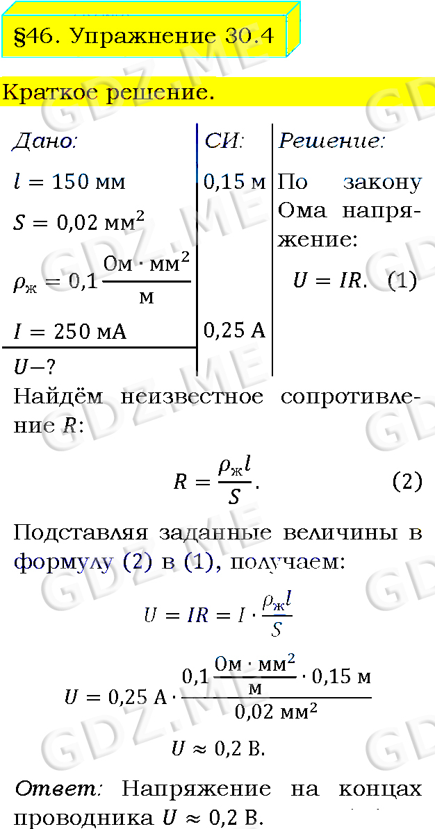 Подробный вариант решения из решебника (ГДЗ): Упражнение номер 4 (§46. Примеры на расчёт сопротивления проводника, силы тока и напряжения. Упражнение 30) по предмету Физика, за 8 класс, авторы учебника Пёрышкин А.В..