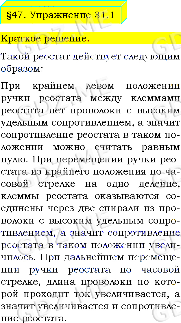 Подробный вариант решения из решебника (ГДЗ): Упражнение номер 1 (§47. Реостат. Упражнение 31) по предмету Физика, за 8 класс, авторы учебника Пёрышкин А.В..