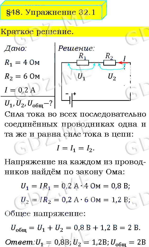 Подробный вариант решения из решебника (ГДЗ): Упражнение номер 1 (§48. Последовательное соединение проводников. Упражнение 32) по предмету Физика, за 8 класс, авторы учебника Пёрышкин А.В..