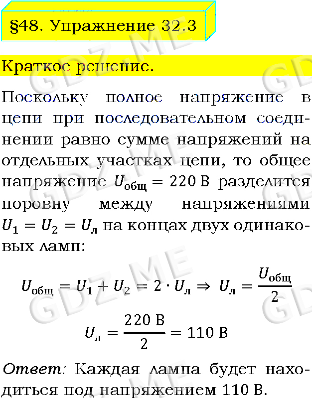 Подробный вариант решения из решебника (ГДЗ): Упражнение номер 3 (§48. Последовательное соединение проводников. Упражнение 32) по предмету Физика, за 8 класс, авторы учебника Пёрышкин А.В..