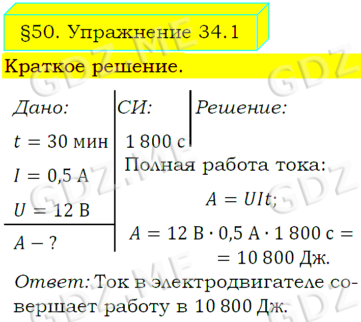 Подробный вариант решения из решебника (ГДЗ): Упражнение номер 1 (§50. Работа электрического тока. Упражнение 34) по предмету Физика, за 8 класс, авторы учебника Пёрышкин А.В..