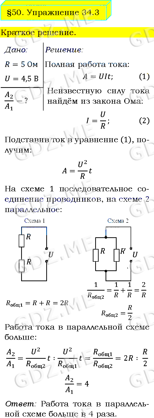 Подробный вариант решения из решебника (ГДЗ): Упражнение номер 3 (§50. Работа электрического тока. Упражнение 34) по предмету Физика, за 8 класс, авторы учебника Пёрышкин А.В..