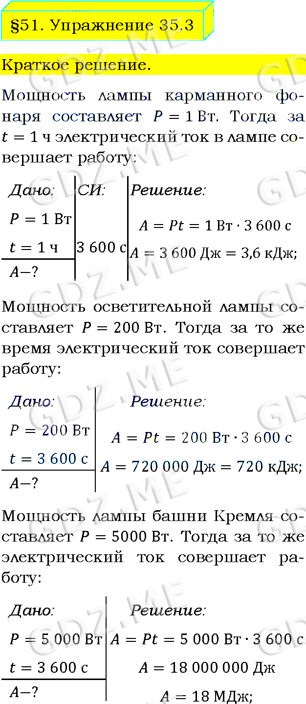 Подробный вариант решения из решебника (ГДЗ): Упражнение номер 3 (§51. Мощность электрического тока. Упражнение 35) по предмету Физика, за 8 класс, авторы учебника Пёрышкин А.В..
