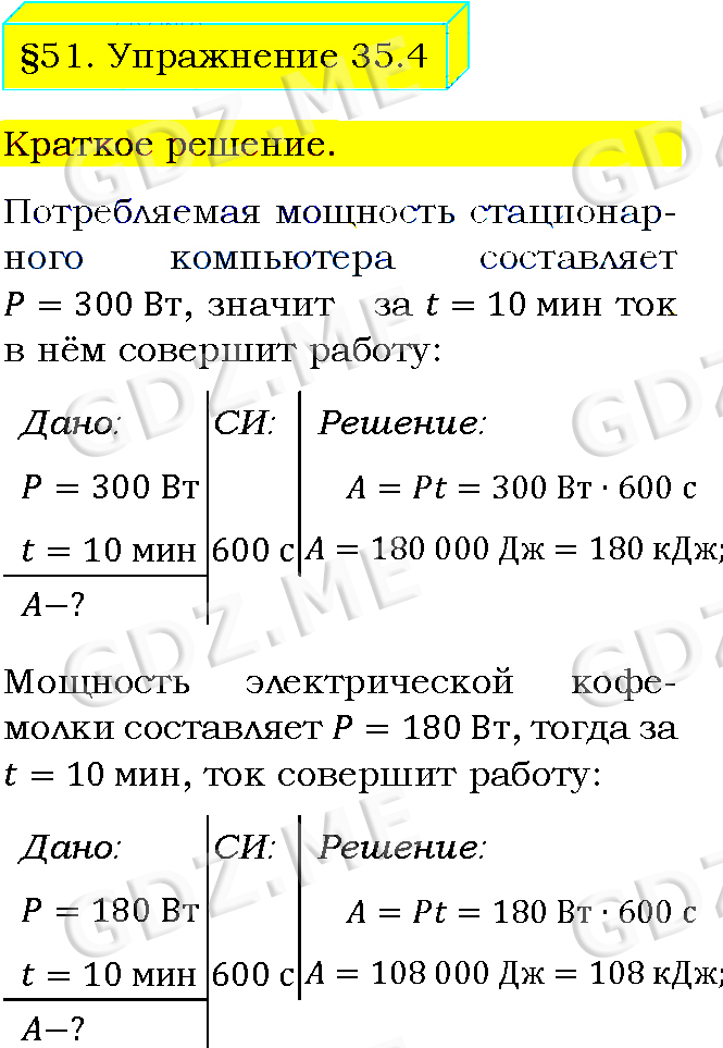 Подробный вариант решения из решебника (ГДЗ): Упражнение номер 4 (§51. Мощность электрического тока. Упражнение 35) по предмету Физика, за 8 класс, авторы учебника Пёрышкин А.В..